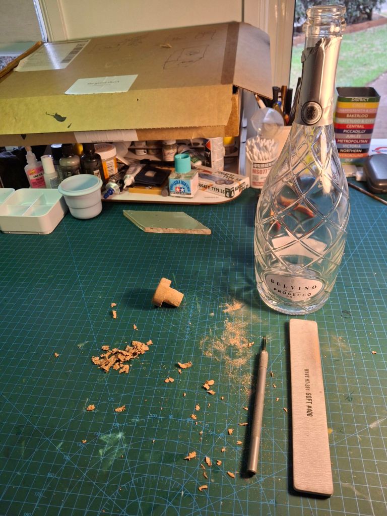Today’s effort was this – ” I really like this champagne style bottle but I want to put this stopper in the top to replace the original cork. Of course the cork on the stopper is too large for the bottle and needs the diameter reduced.