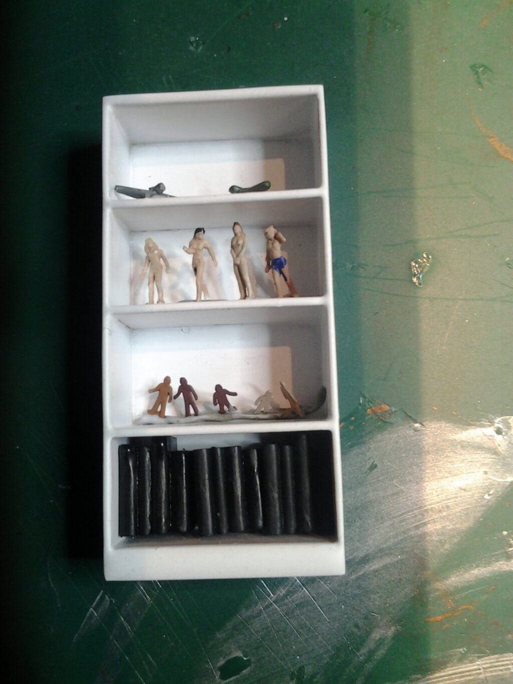 I have been steadily beavering away on this project recently with some progress. Nothing startling done, but just attacking each aspect. The desk is nearing completion with another lamp ready to be added. There are still books, paints etc to add but these are all doable. I can’t see any show stoppers now, just a matter of doing the work. Below is a closeup of the shelves with some figures and planes but the figures need more painting as the size is too big to skimp on detail painting, I wasn’t sure about this till I put it all together. More work is needed but it is getting there.